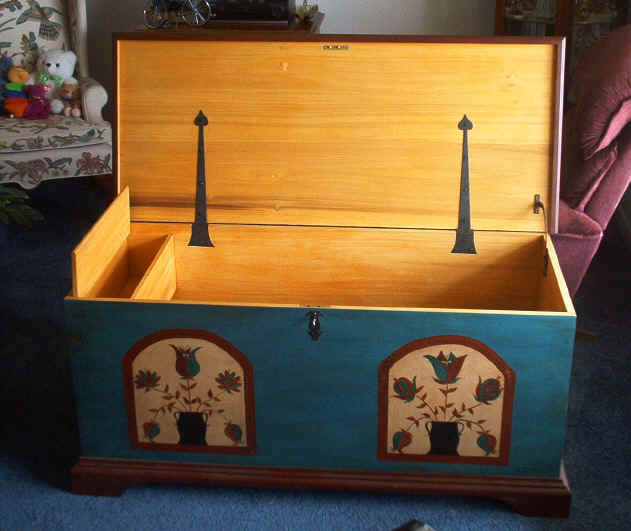 Customer GalleryPainted ChestThis Pennsylvania Dutch painted blanket chest is built from poplar. It was donated to the Cancer Society for a fund raiser and raised $1500. Built by Bob Hollister, Lancaster, PA |